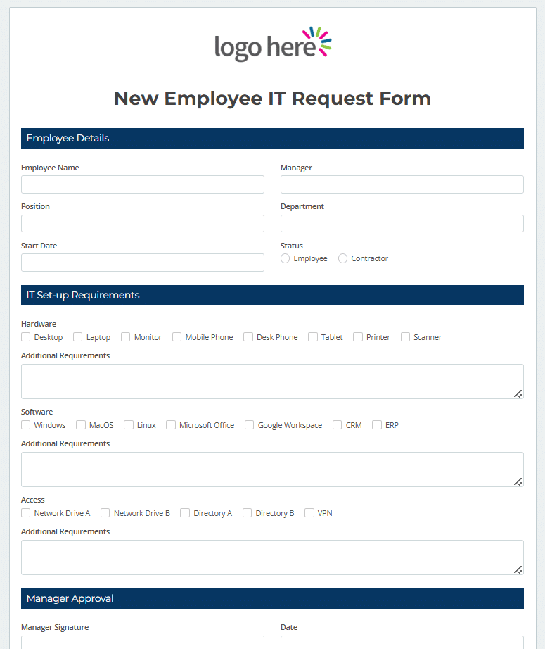 View templateOur New Employee IT Request Form helps HR and managers quickly arrange the right IT equipment, software, and user access.