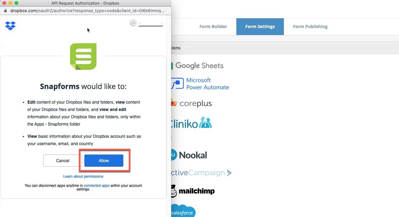 This is a direct integration between Snapforms and Dropbox and is an alternative to the more flexible approach of using our Microsoft Power Automate connector.