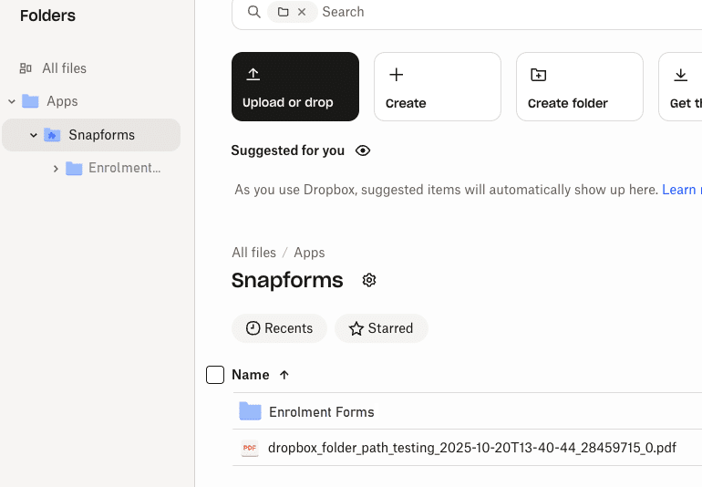The Snapforms Dropbox integration allows you to automate the transfer of form response PDF files and associated file uploads to your Dropbox account.