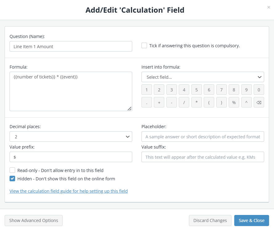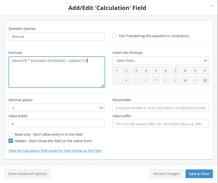For the total value, add a Calculation field with the name ‘Amount’ and and insert a formula that calculates your final amount based on all of your product/pricing fields. For example: {{event?}} * {{number of tickets}}) + {{addon1?}}