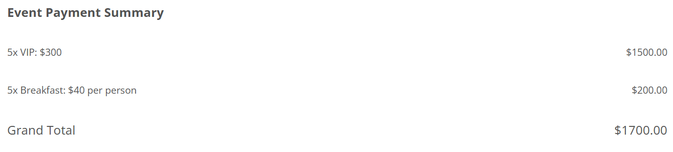 For each line item in your payment summary, add a Calculation field and insert a formula to calculate the line item total. For example: {{number of tickets}} * {{event}}