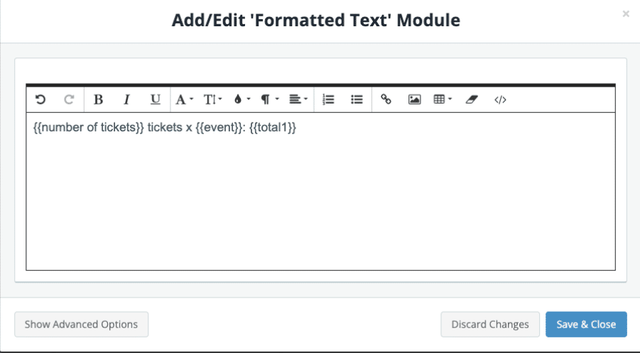 Tip: In the Formatted Text module, tables can be used to neatly organise and display the order information. For greater flexibility when designing the payment summary layout, you can also split the order information into multiple Formatted Text fields.